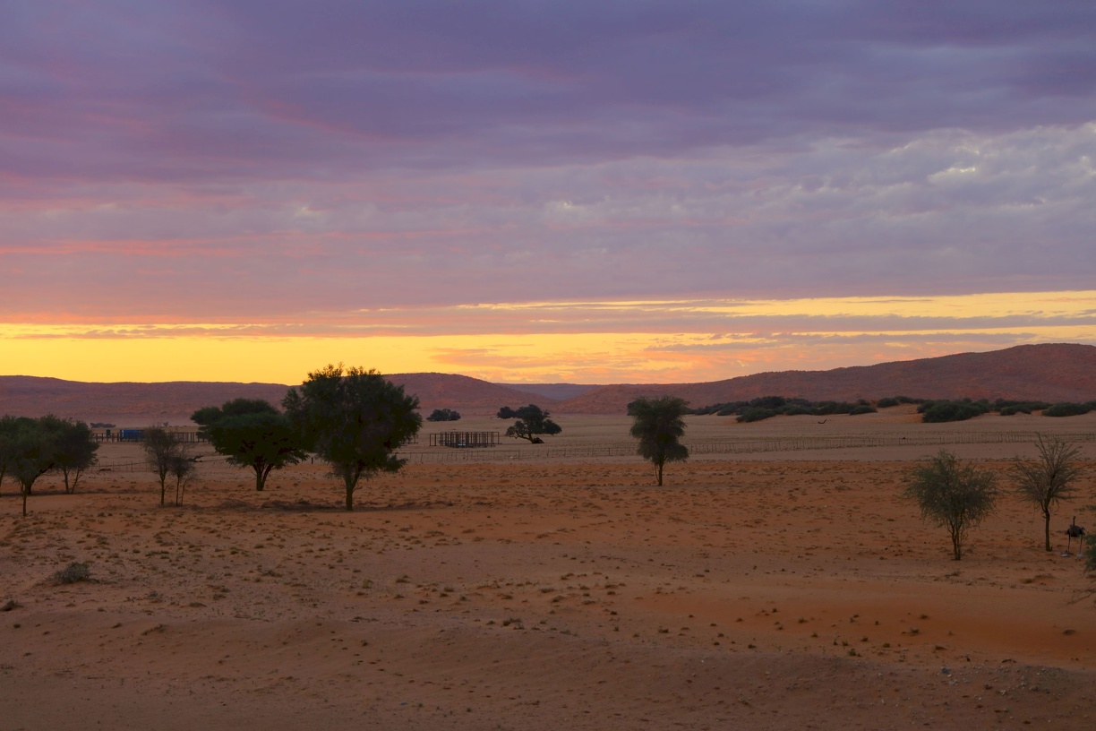 Nachdem wir die ganze Nacht durchgefahren sind, kamen wir gegen 8:30 Uhr in Mariental an, wo uns unsere Busse schon erwarteten. Eine Lange Fahrt durch die Kalahari nach Sossusvlei mit Zwischenstation in Martahöhe und der Hammersteinlodge. In der Hammersteinlodge gab es Mittagessen neben Gehegen mit Gepard, Rotkatze und Hyäne. Am Nachmittag bezogen wir unser Quartier in der Sossusvlei Lodge.