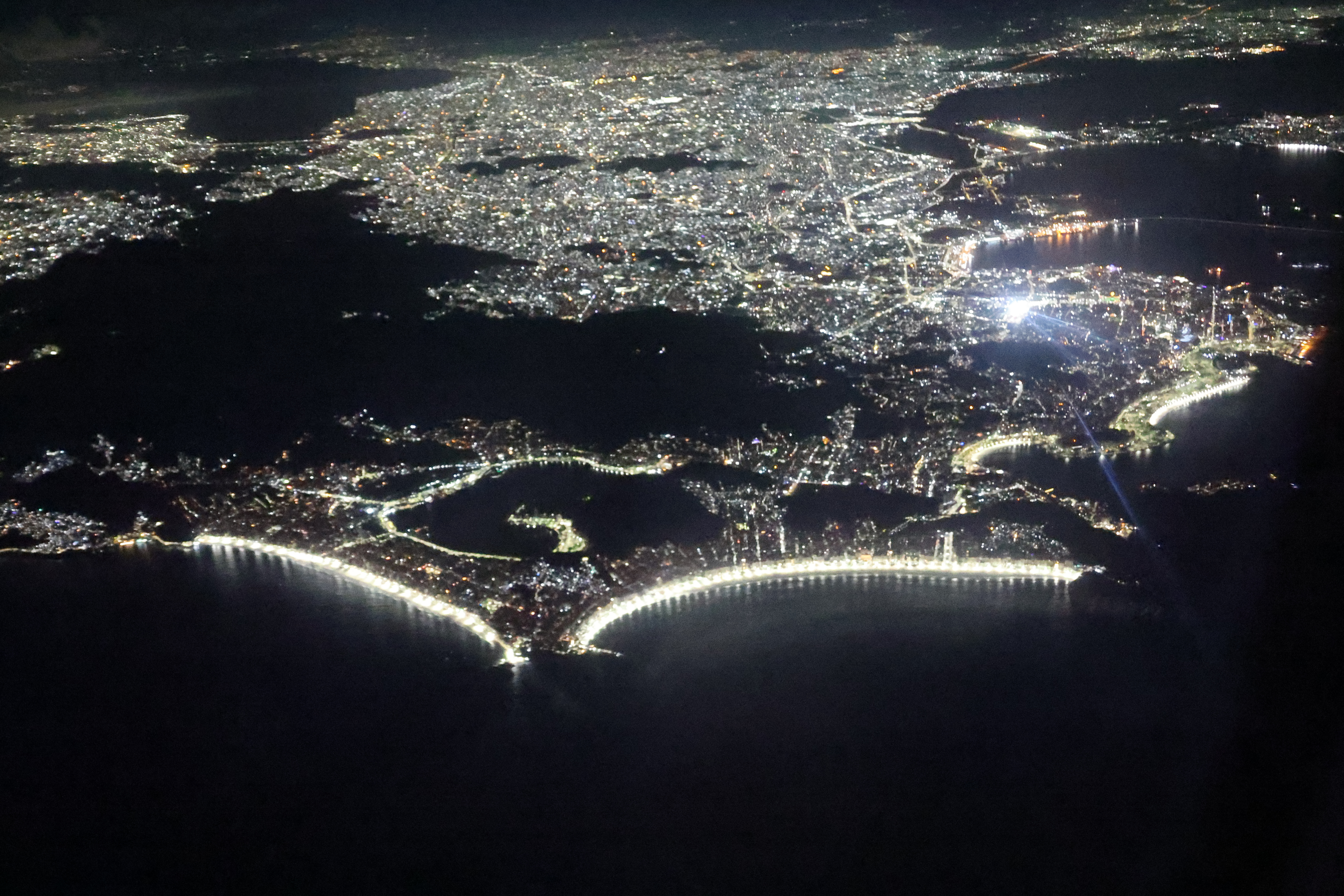 vorne die beleuchteten Strände der Copacabana und Ipanema. dahinter die Stadt